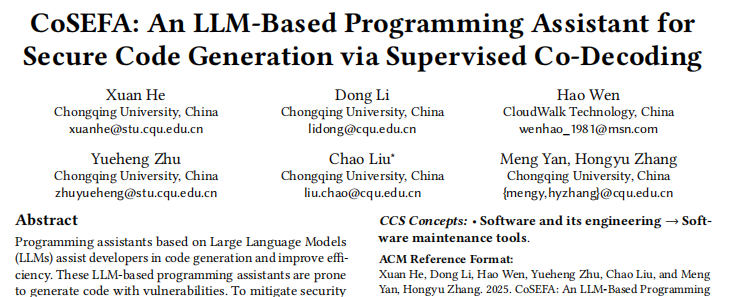 近日,云從科技與重慶大學大數(shù)據(jù)與軟件學院聯(lián)合研發(fā)的編程智能體——CoSEFA(Code SEcurity and Fix Agent)被軟件工程領域頂尖會議ACM SIGSOFT軟件工程基礎國際會議(FSE 2025)正式錄用。